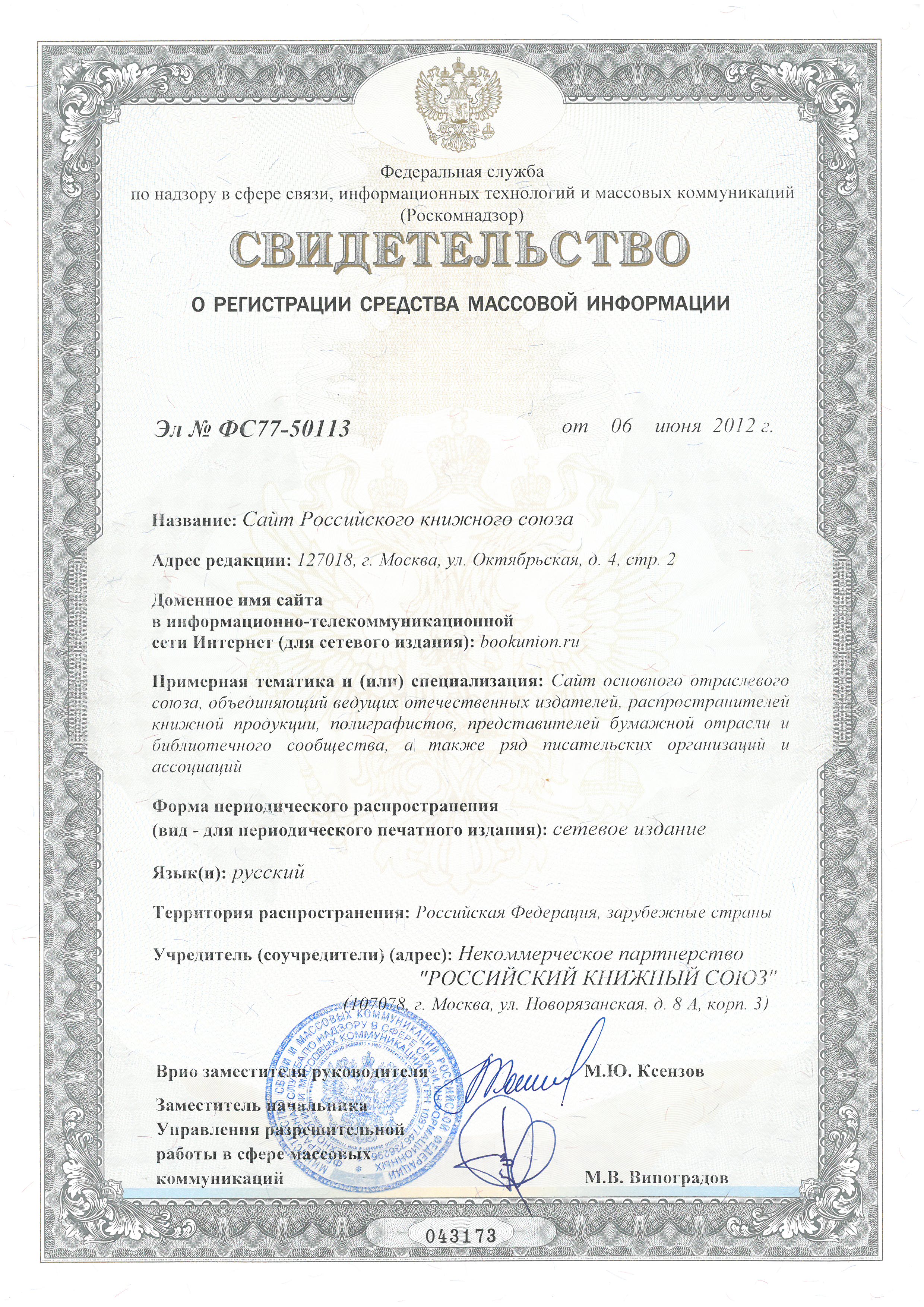 Свидетельство о регистрации средства массовой информации Эл №ФС77-50113. Выдано Роскомнадзором 06 июня 2012 года.