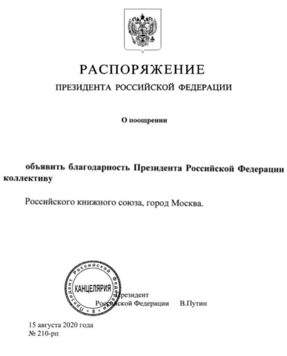 Распоряжением Президента Российской Федерации от 15.08.2020 №210-рп «О поощрении» Российский книжный союз получил благодарность за высокий профессионализм сотрудников и безупречную работу над проектами.
