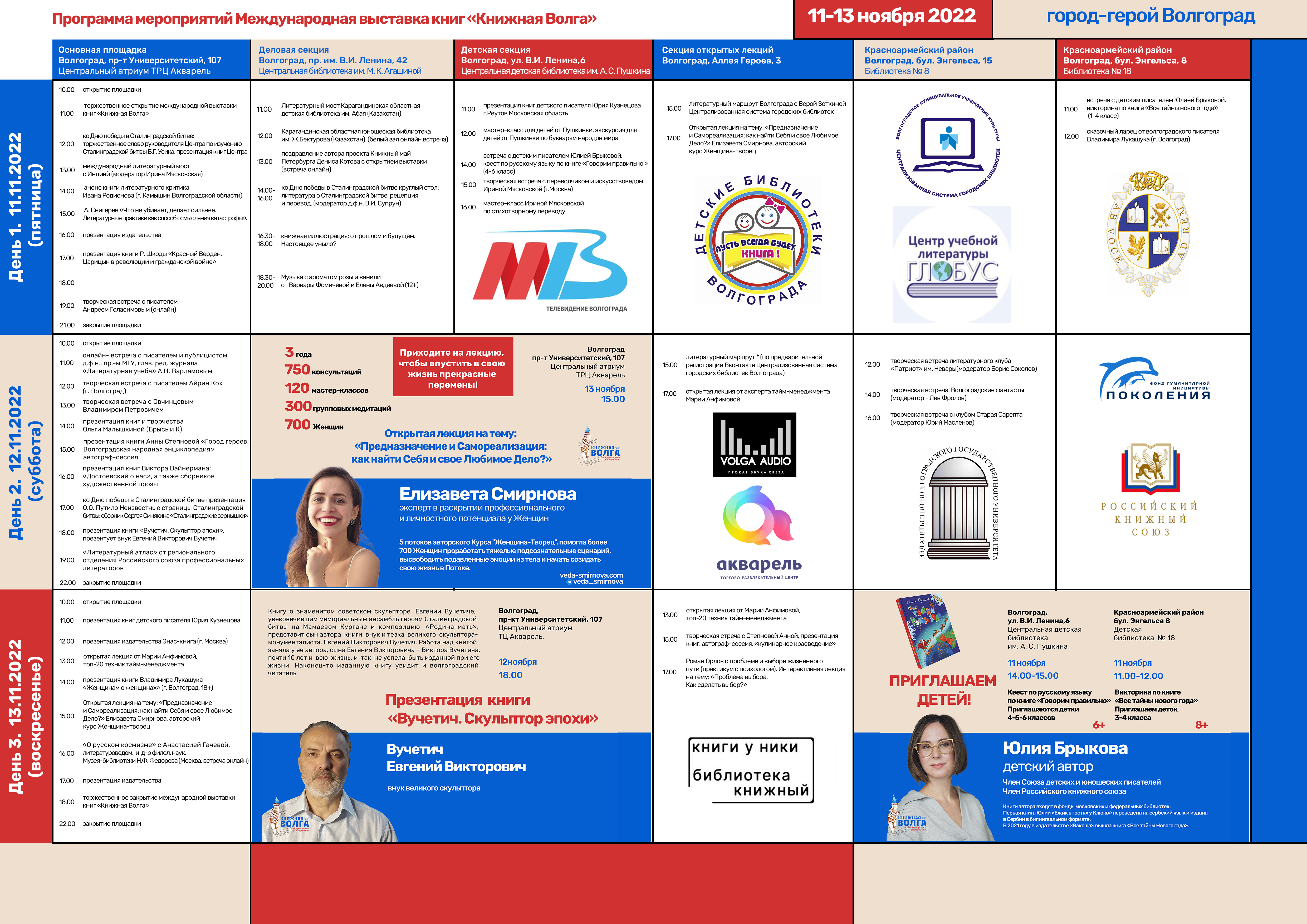 Впервые в Волгограде с 11 по 13 ноября 2022 года состоялась I международная выставка книг «Книжная Волга». Уникальный для региона культурный проект объединил в своей работе 6 городских площадок проведения, на которых успешно реализовано 40 мероприятий формата офлайн и онлайн участия. Приветственное слово выставке от Российского книжного союза открыло насыщенную программу мероприятий.