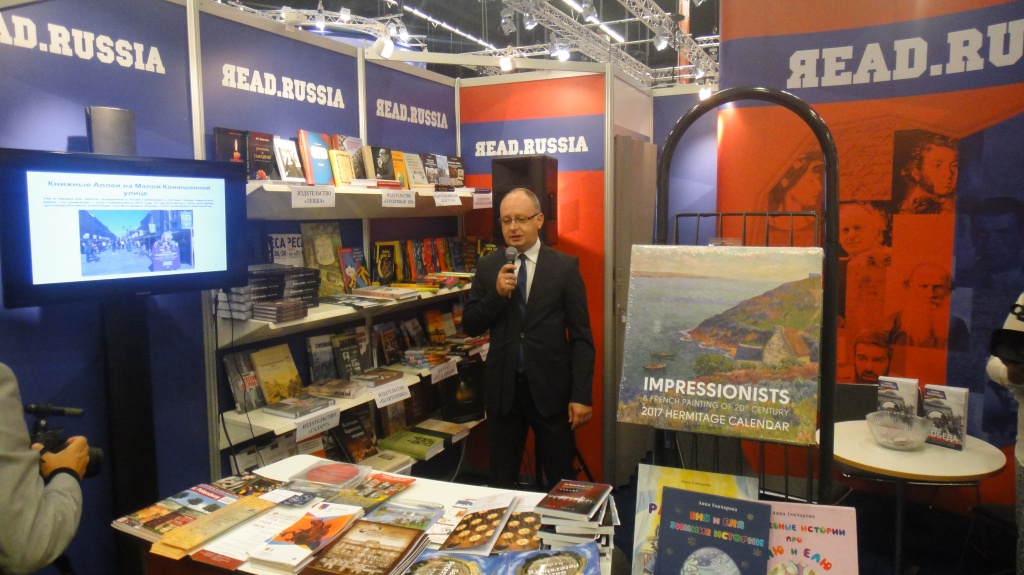 На стенде России были представлены книги крупных петербургских и московских издательств. Среди них можно найти современную литературу, классику, альбомы по истории искусств. Особое вынимание организаторы стенда уделили детской литературе, которая пользуется неизменным спросом у шведских гостей выставки. «Выключите телевизор, закройте компьютер, возьмите в руки книгу», – сказал в своем выступлении петербургский писатель Евгений Водолазкин, чьи книги переведены на 23 иностранных языка. Организатор стенда, Комитет по печати и взаимодействию со СМИ Санкт-Петербурга, надеется, что многочисленные гости последуют этому мудрому и актуальному совету.