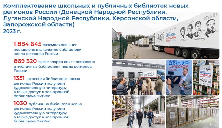 В июле 2023 года РКС приступил к реализации Распоряжения Президента Российской Федерации по комплектованию фондов школьных и публичных библиотек новых регионов России. За три месяца было напечатано и поставлено 2 761 362 книги (1 894 102 книг в школьные библиотеки, 867 260 книг в публичные библиотеки) в 2 381 библиотеку. Школьные библиотеки комплектовались по спискам произведений из школьной программы, утверждённой Минпросвещения России. В публичные библиотеки помимо книг из школьной программы были поставлены книги для дошкольников и произведения современных писателей по спискам, утверждённым Минцифры и Минкультуры России. Первая брендированная книжная колонна из шести 20-титонных фур поехала в новые регионы уже 26 августа. Всего было отправлено порядка 60 машин. Последняя партия книг была отправлена РКС 7 октября 2023 г.