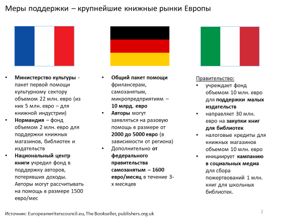 Максим Борисович Лозовский, директор по цифровому контенту издательства «АСТ», дал оценку эффективности мер государственной поддержки в России и за рубежом в текущем году. В целом опыт европейских стран схож: государство выделяет средства на поддержку малого и среднего бизнеса, общественные организации учреждают фонды в поддержку авторам, независимым книжным, малым издательствам. «Если посмотреть на англо-саксонский мир, то в первую очередь там поражают масштабы экономической поддержки. В США — федеральная программа поддержки малого и среднего бизнеса объемом 669 миллионов долларов, беспроцентные кредиты от местных властей штатов, финансирование запасов. В Великобритании — полный спектр инструментов финансовой поддержки: правительственные займы и гарантии, беспроцентные кредиты, программы сохранения рабочих мест, гранты, налоговые каникулы. Все это дало ощутимый результат, что кадры в отрасли были сохранены», — поделился эксперт.
