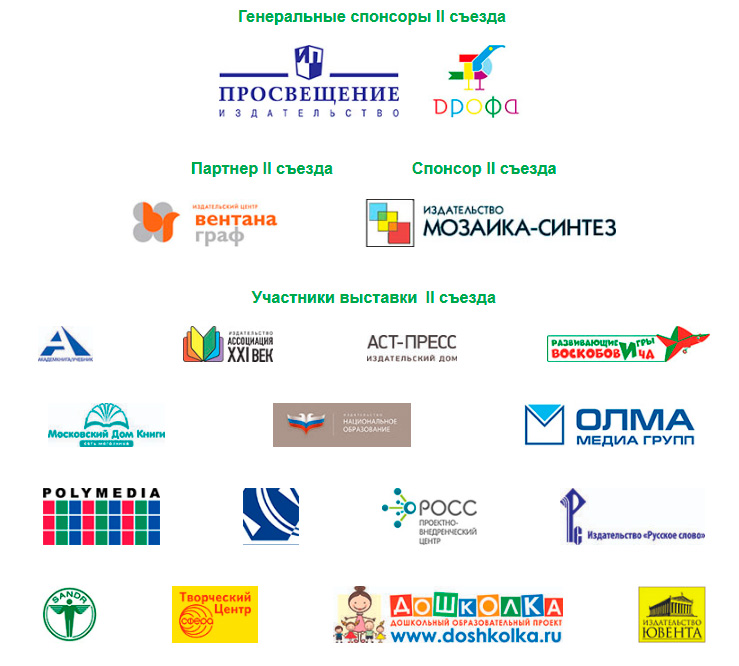 Генеральными спонсорами II Всероссийского съезда работников дошкольного образования выступили крупнейшие российские учебные издательства «Просвещение» и «Дрофа».